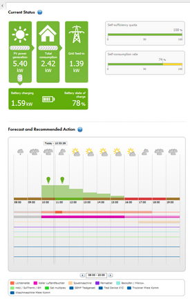 Having access to all key household appliances, the optional battery-storage system and the PV generation unit, the Sunny Home Manager always knows how much energy is available and where it is needed. Aided by a weather forecast from Internet data and individual adaptation to local conditions, it is able to accurately predict solar irradiation for a few hours into the future and supply the connected household appliances with low cost PV energy. Thanks to the Sunny Home Manager’s self-learning function, appliances such as the heat pump run exactly when there is sufficient sunlight available, making it possible to cover electric power demand by solar production.